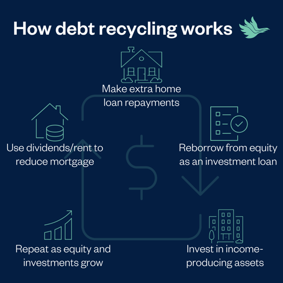 Debt recycling is about reshaping how your loans and cash are structured so you can build wealth and improve tax efficiency over time. It gradually converts your home loan, where interest isn’t tax‑deductible, into investment debt, where the interest may be deductible.