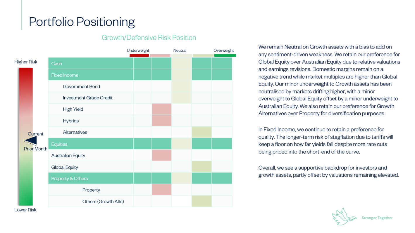 - Equity markets: Despite challenges earlier in the year, Q2 earnings in the US and FY earnings in Australia were encouraging. Overall, we see the year ending with positive equity returns, while recognising that seasonal volatility through September and October remains a risk.