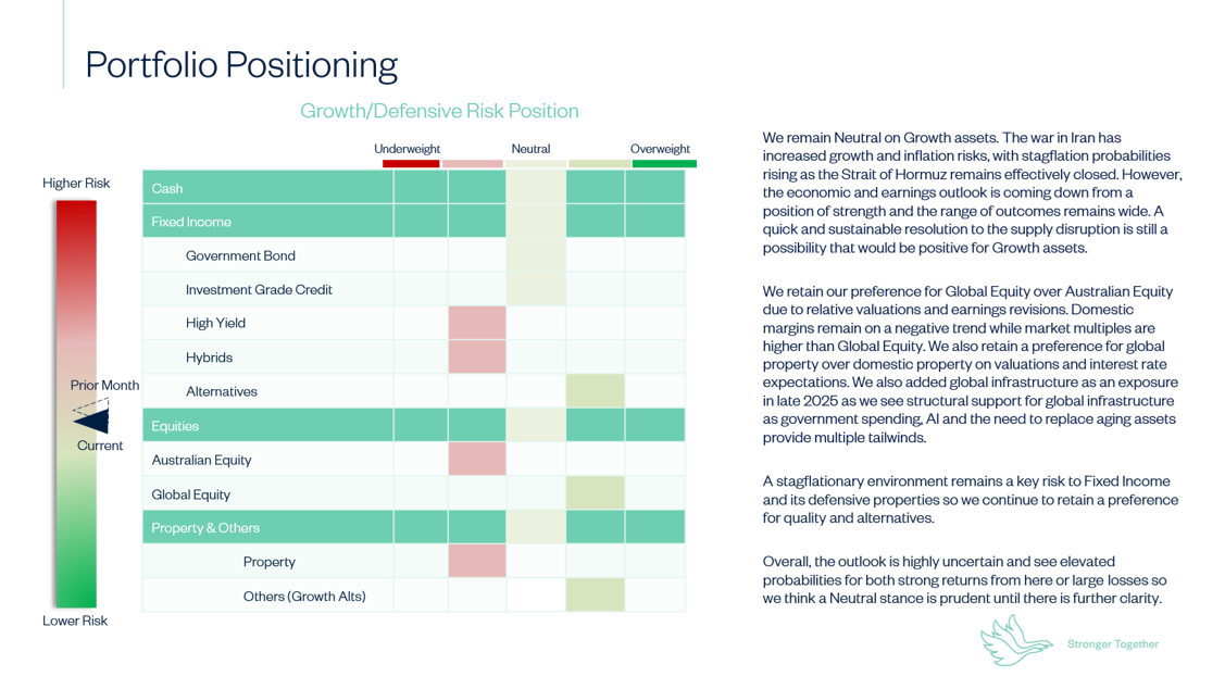 We expect equity markets to finish the year modestly higher, supported by the underlying government spending and US banking regulation easing. We expect an easing of geopolitical risks from ‘peak fear’, while remaining susceptible to volatility and a moderate impact on global economies from global supply shortages. At the time of writing in mid-April 2026, most investors were neutral to underweight equities, and volatility in markets is starting to reduce, setting the scene for a renewed positive market outlook. The business cycle is supportive, being in the early to middle stages of an economic recovery, with the disruption from the war potentially extending the timing of the recovery cycle.